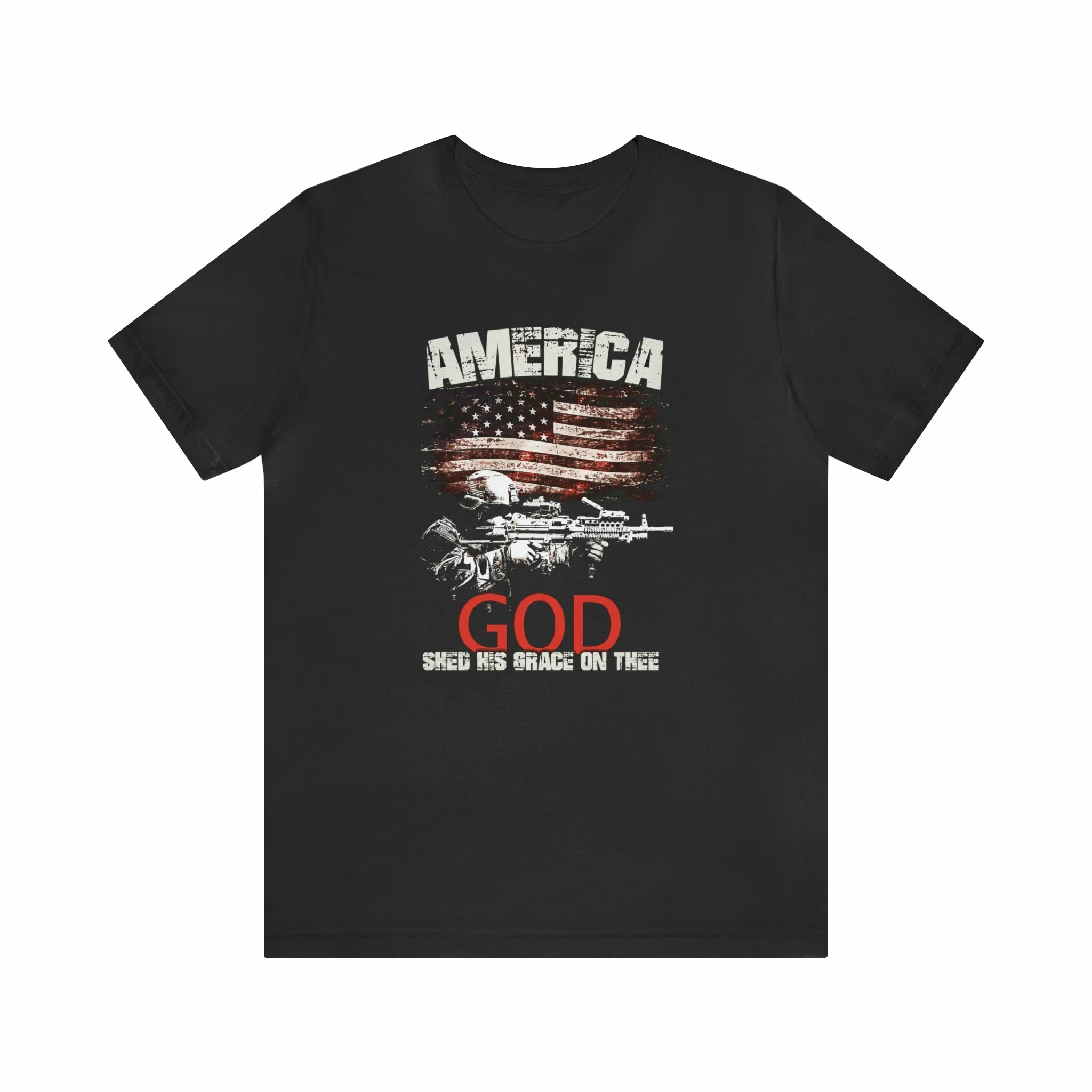 Featuring a beautiful and patriotic design, this t-shirt is a perfect gift for anyone who loves America and wants to show their support for their country. The bold print on the front of the shirt features the powerful phrase “AMERICA God Shed His Grace On Thee” which will surely catch the attention of passersby.