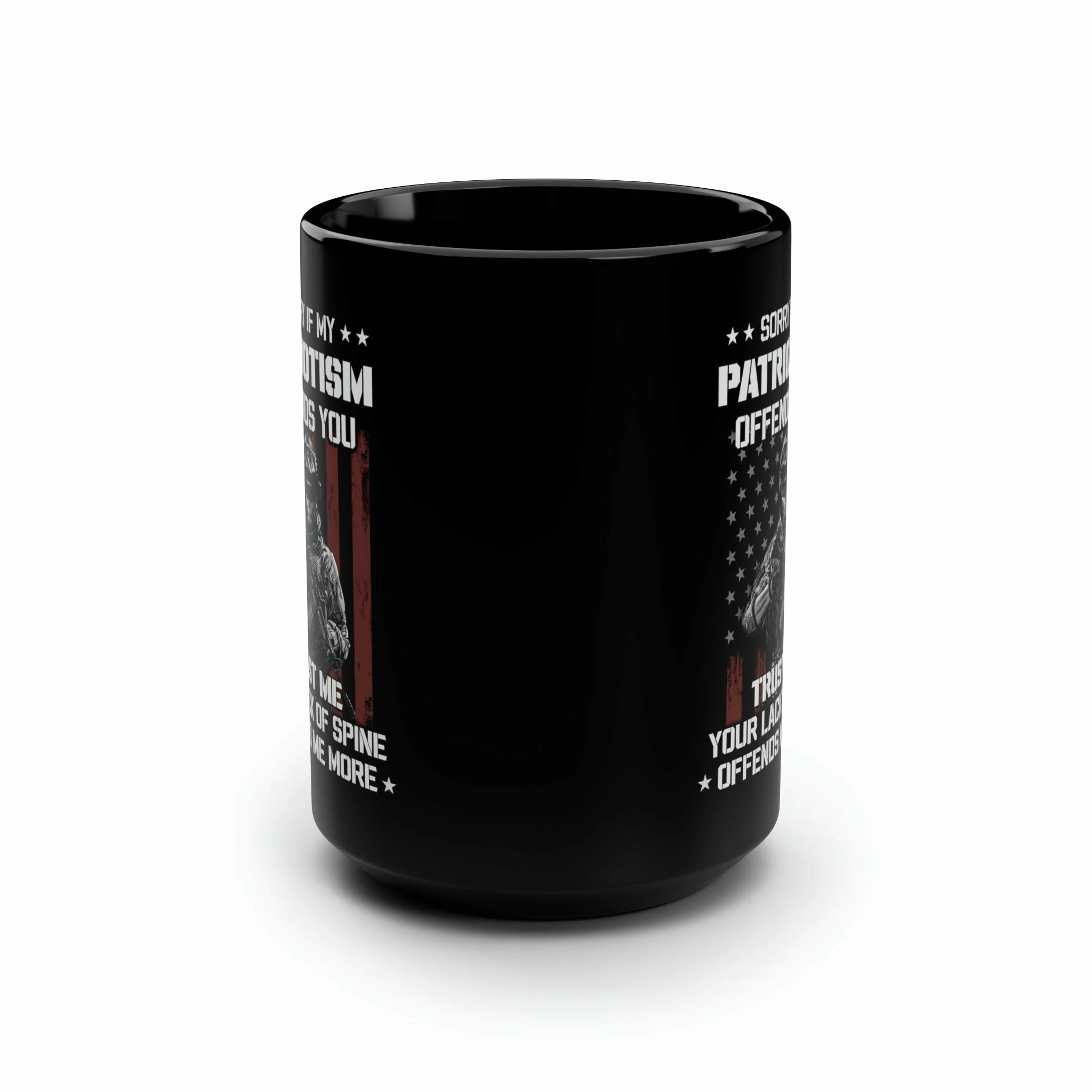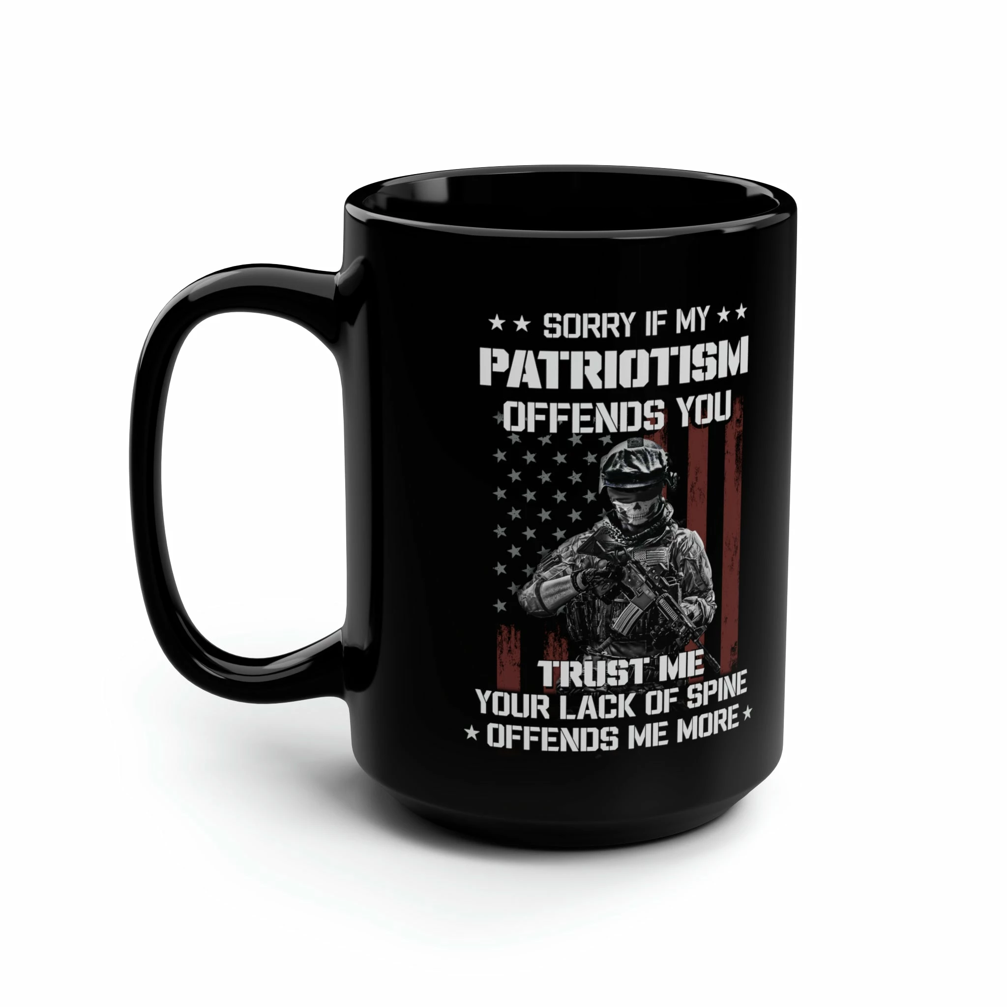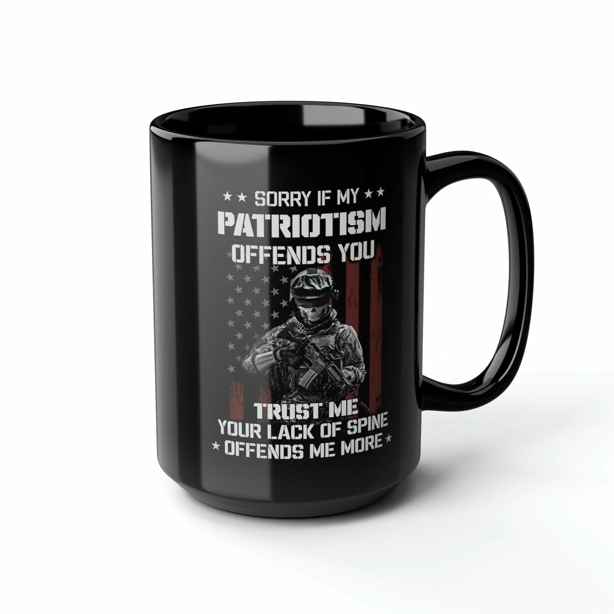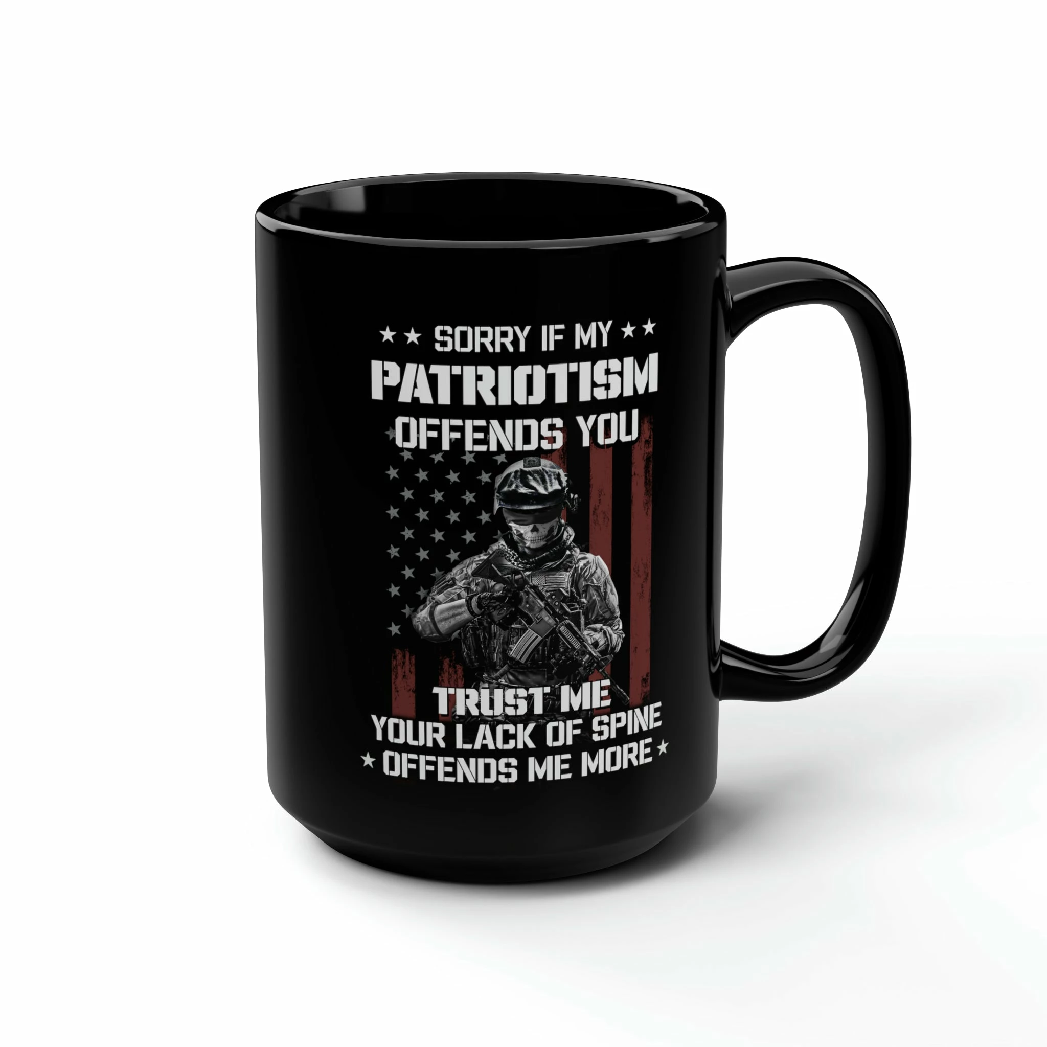 Introducing our American Soldier Patriotism Mug 15 oz, a bold and unapologetic statement of unwavering national pride. Displaying the powerful message, “SORRY IF MY PATRIOTISM OFFENDS YOU TRUST ME YOUR LACK OF SPINE OFFENDS ME MORE,” this mug is designed to evoke a deep sense of patriotism and strength.