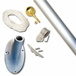 This external halyard commercial grade flagpole kit comes complete with one 1 1/2″ diameter clear anodized aluminum pole with a cast aluminum single-pulley stationary truck, and topped with a 3″ anodized aluminum ball ornament. Also included is 50 feet of 1/4 inch braided polypropylene halyard, 2 nylon flag snaps, a 9″ cast aluminum cleat with mounting screws and cast aluminum mounting bracket. Optional 3′ X 5′ flag is sold separately by AmericanFlags.com and mounting screws should be obtained locally depending on your mounting surface (wood, concrete, etc). Picture shows two kits.
