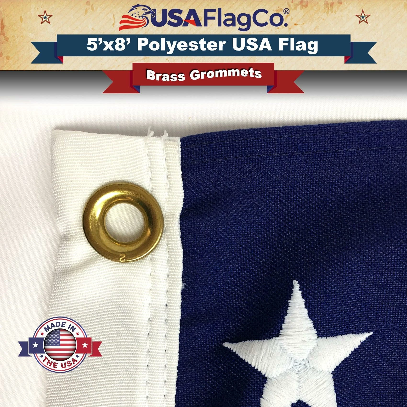 The strongest, longest-lasting material, developed for maximum durability in strong wind conditions and intense sun. USA Flag Co. polyester flags are made of tough 2-ply 100% spun polyester. They stand up to unpredictable weather conditions. Each American flag is finished with a tough polyester canvas heading and spurred brass grommets and four needle fly hem.