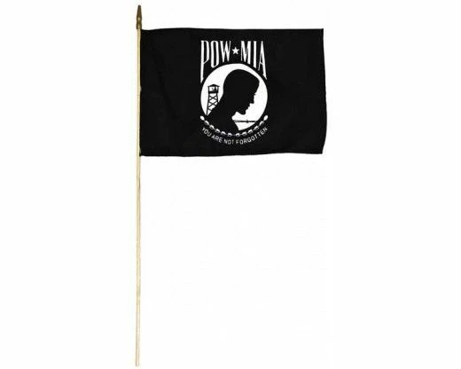 These handheld POW-MIA flags are perfect for parades, ceremonies or gravesites. The are carefully printed on soft, silky, top-of-the-line Endura-Poly material measuring 12″ X 18″. The flagstaffs are 30″ in height and made of natural wood. Be sure to check out our generous volume discounts.