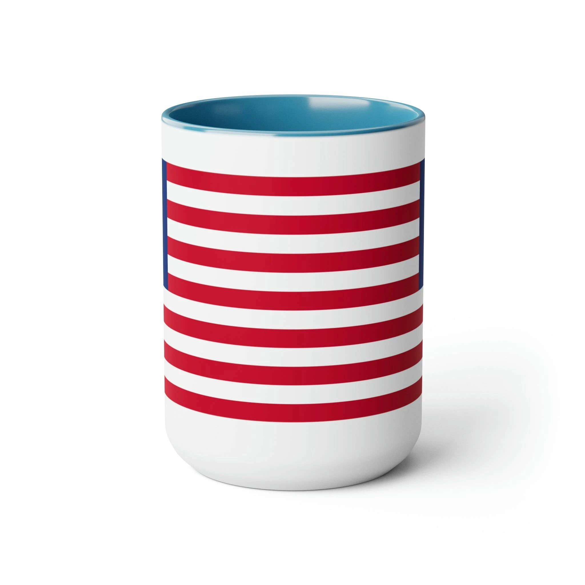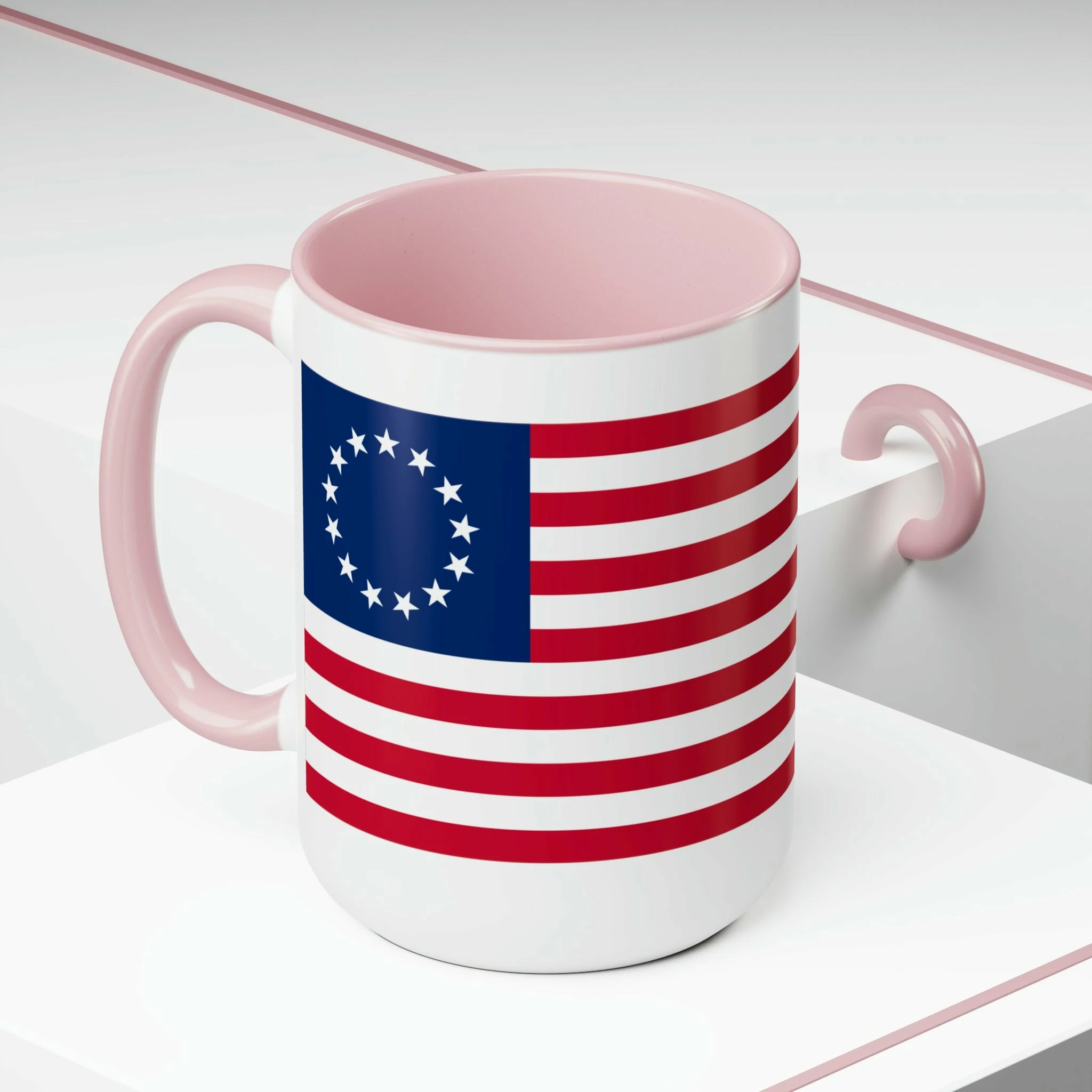 Here to bring big gulps of coffee and style, these two-tone Betsy Ross Flag coffee mugs help people around the world start the day just right. Choose between 5 different color options to best complement your designs. Each Betsy Ross Flag mug comes with a colored handle, a colored interior, and a classy, glossy finish so that your mugs become an instant favorite.