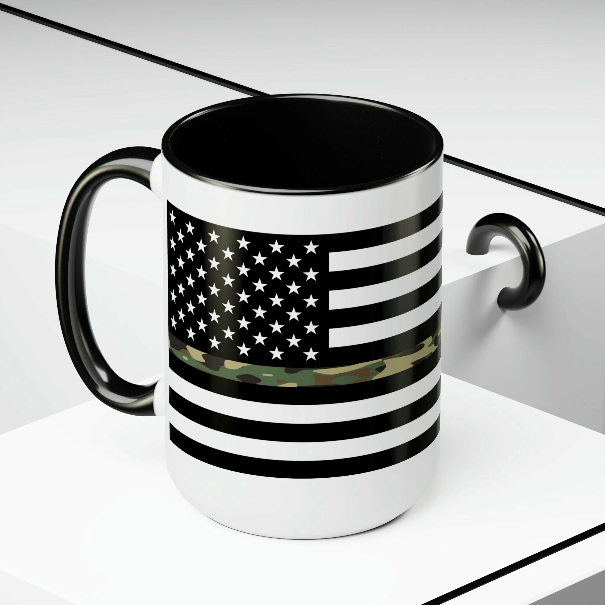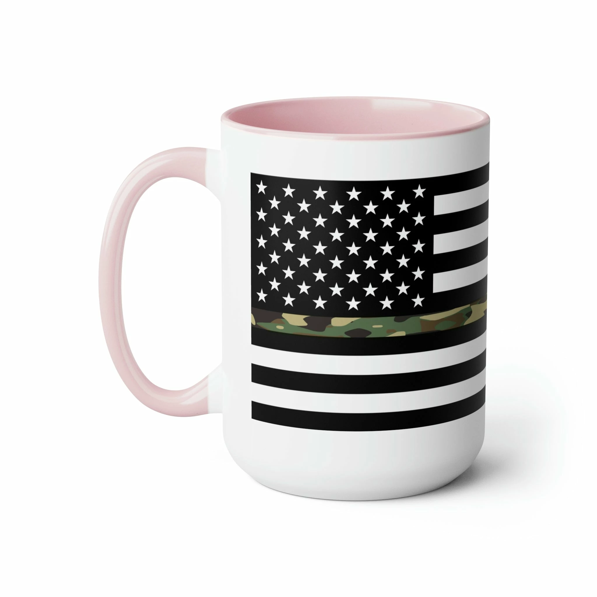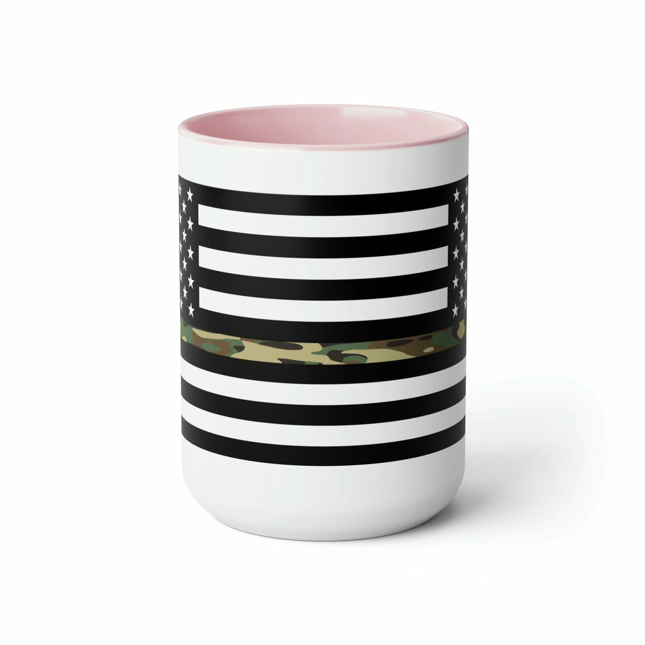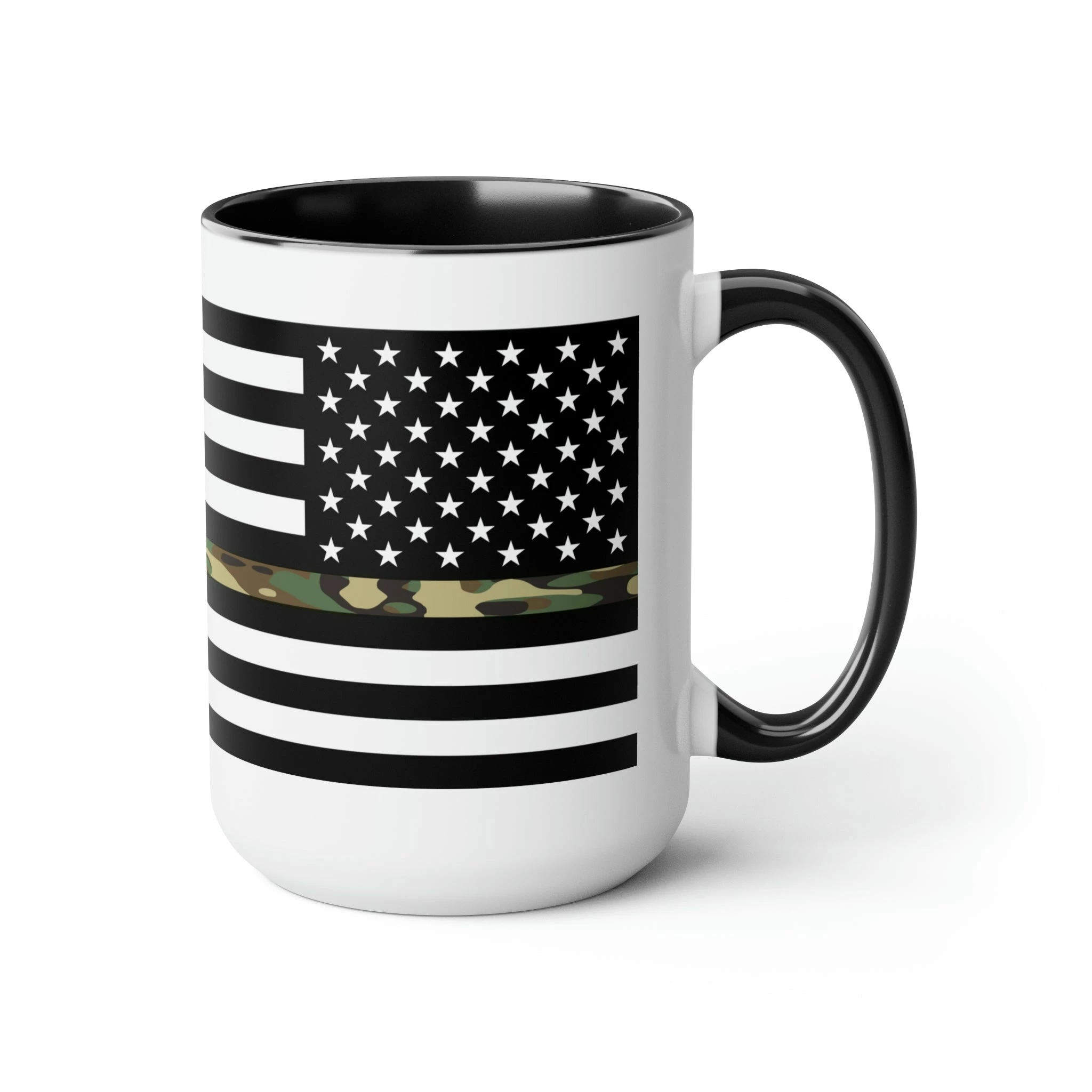 Here to bring big gulps of coffee and style, these two-tone Thin Camo Line Flag coffee mugs help people around the world start the day just right. Choose between 5 different color options to best complement your designs. Each Thin Camo Line Flag mug comes with a colored handle, a colored interior, and a classy, glossy finish so that your mugs become an instant favorite.