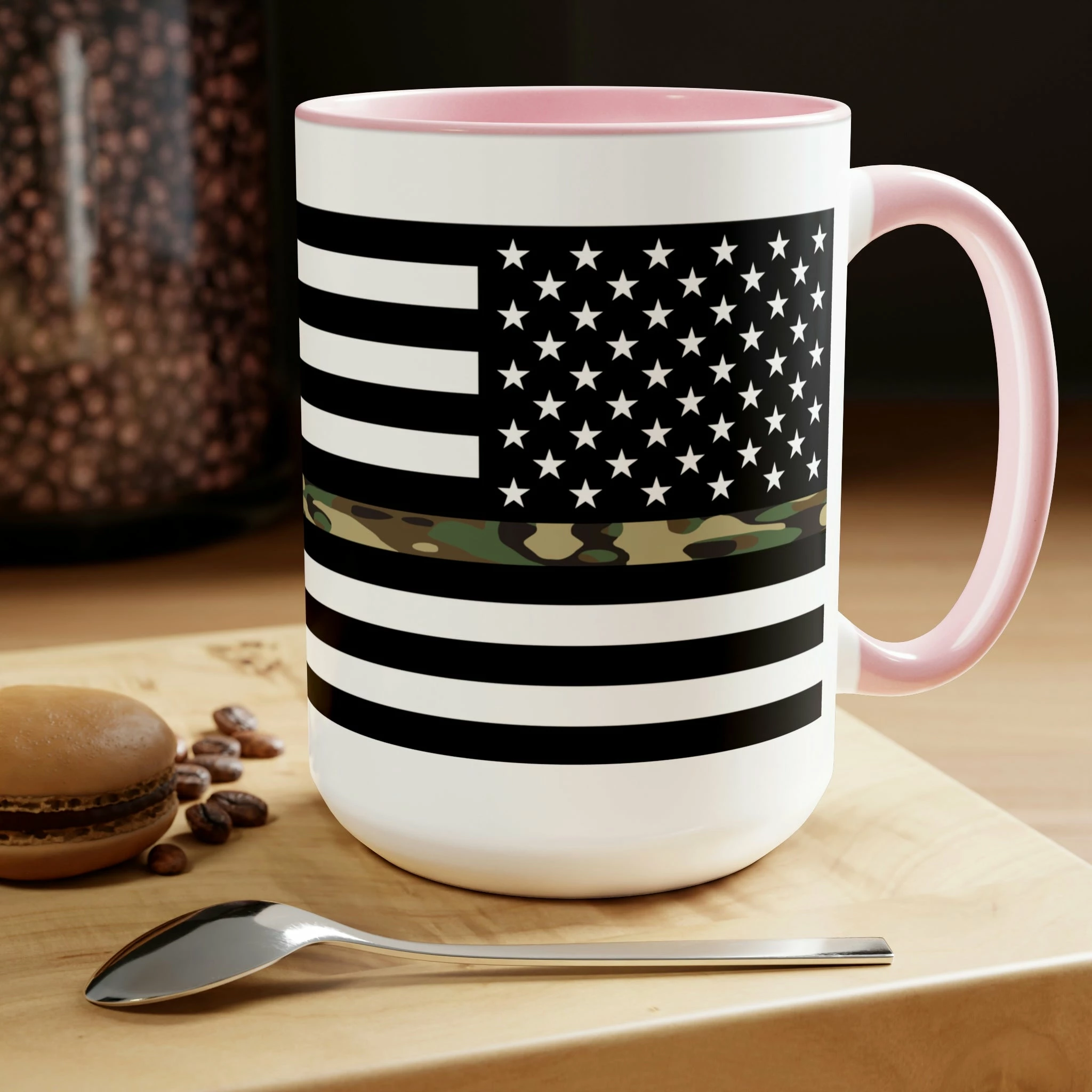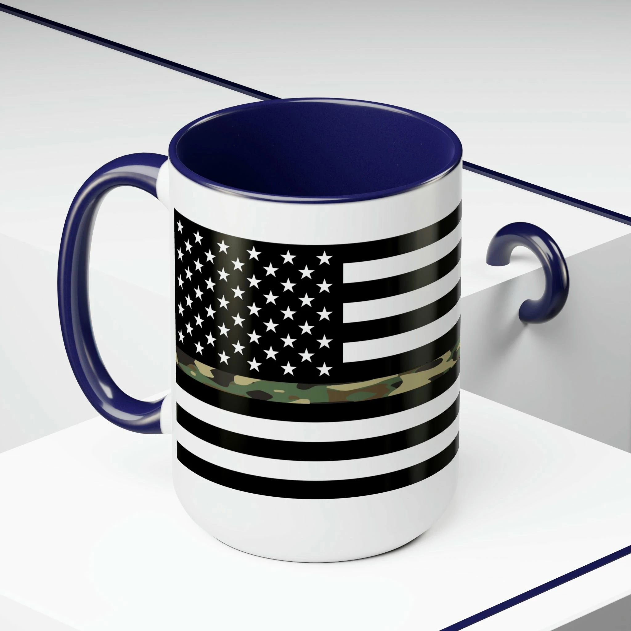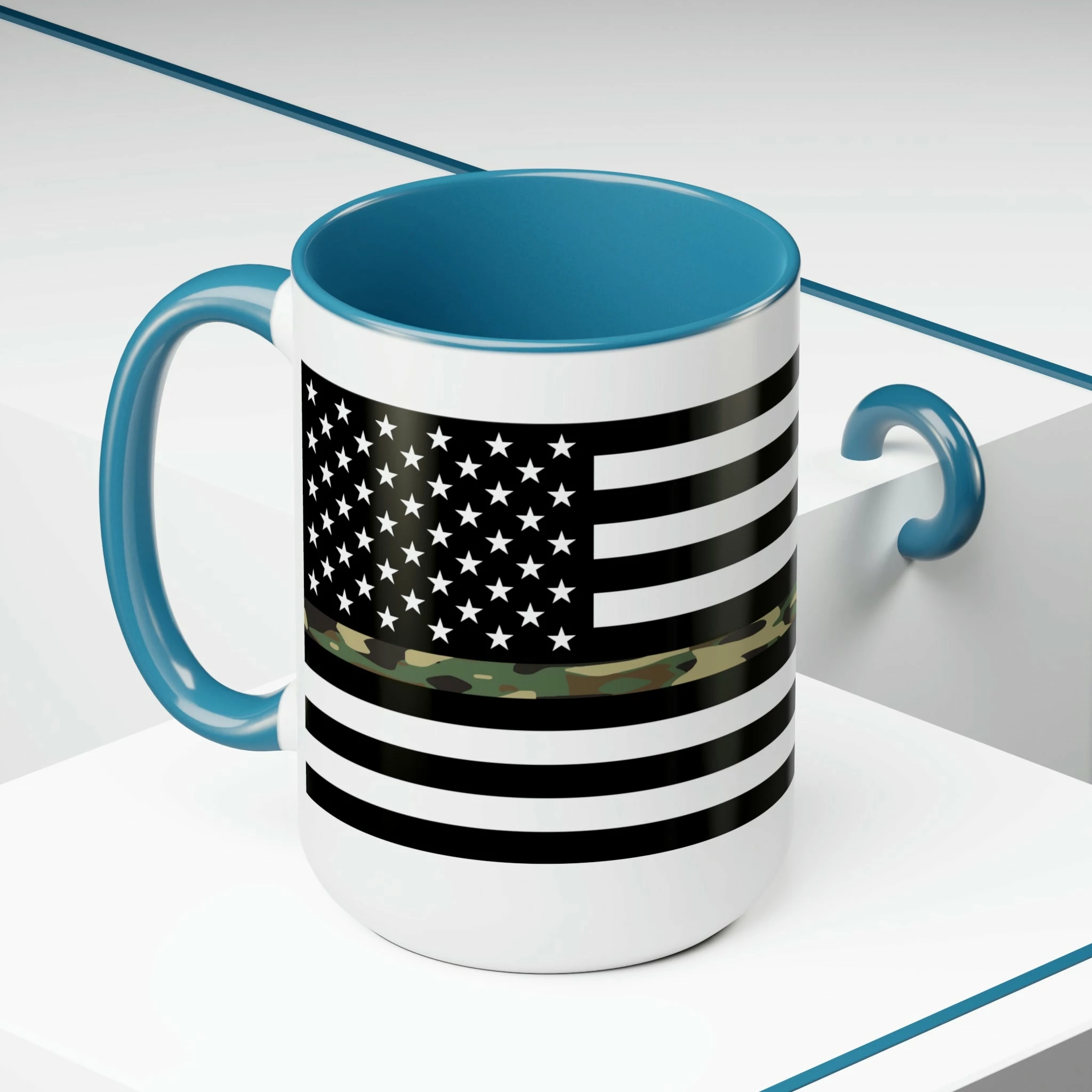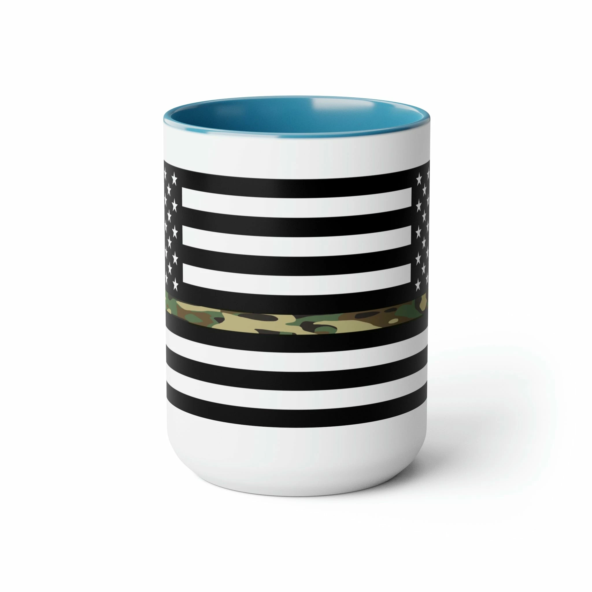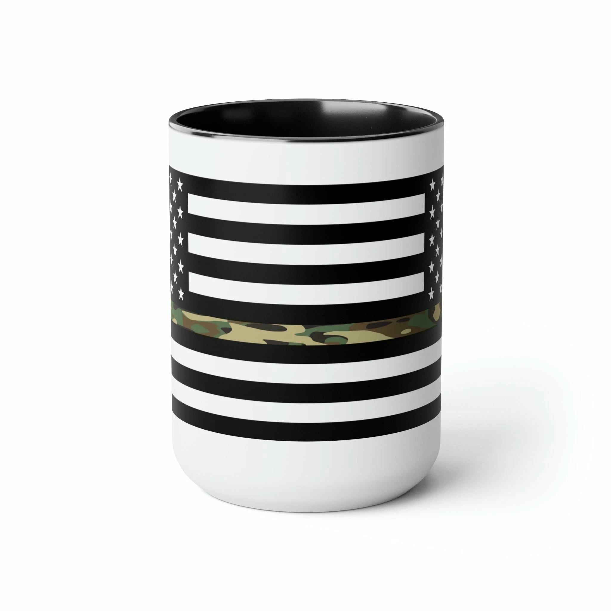 Here to bring big gulps of coffee and style, these two-tone Thin Camo Line Flag coffee mugs help people around the world start the day just right. Choose between 5 different color options to best complement your designs. Each Thin Camo Line Flag mug comes with a colored handle, a colored interior, and a classy, glossy finish so that your mugs become an instant favorite.