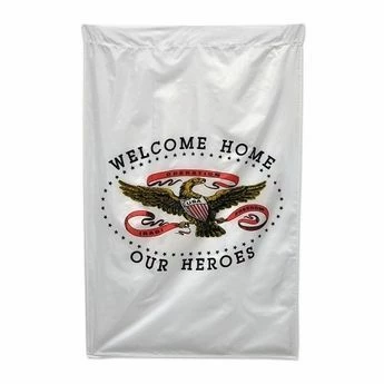 This double sided Welcome Home Our Heroes Banner is constructed of heavy duty weather-resistant nylon. It measures 28″ X 40″ and is finished with a banner sleeve and tab to slide over standard 1″ diameter flagpole.